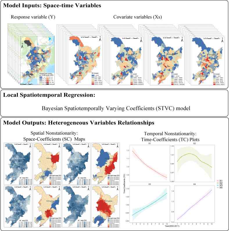 Bayesian Spatiotemporally Varying Coefficients (BSTVC) series models (2019, 2020, 2022): A unified full-map approach to detecting spatiotemporal heterogeneity of variable relationships.