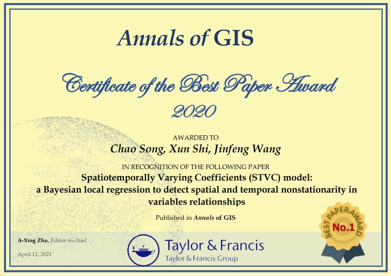 JUNE, 2021. NEWS of winning the best paper award. Chao Song’s paper “Song C, Shi X, Wang J. Spatiotemporally Varying Coefficients (STVC) model: A Bayesian local regression to detect spatial and temporal nonstationarity in variables relationships[J]. Annals of GIS, 2020, 26(3): 277-291” has won 1st place in the best paper award evaluation for papers published in Annals of GIS in 2020.
