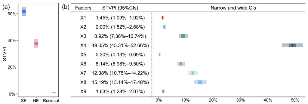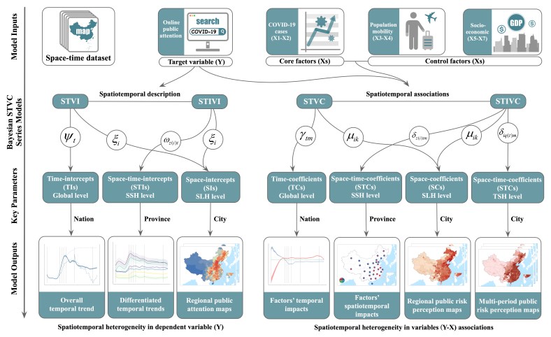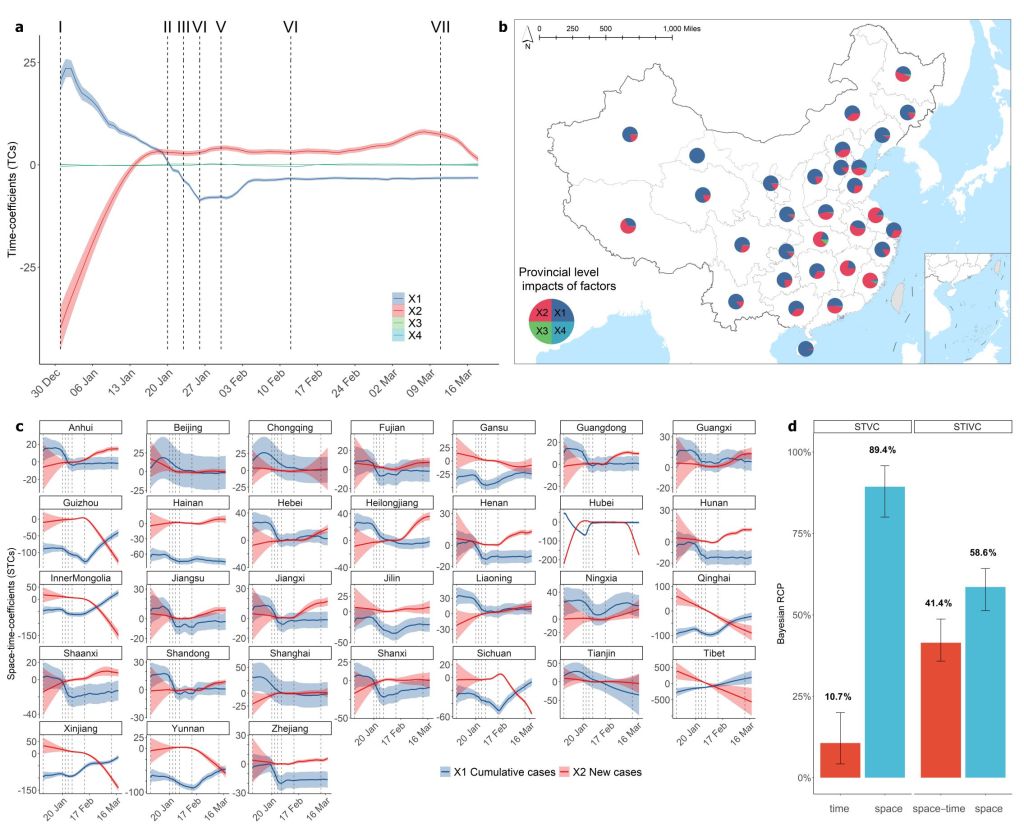 2022. We innovatively introduced the variance partitioning theory to extend the Bayesian STVC modeling system in order to propose a spatiotemporal variance partitioning index (STVPI) to characterize the space-time relative importance (explainable percentage) of explanatory factors on the target variable (Wan, et.al. 2022).