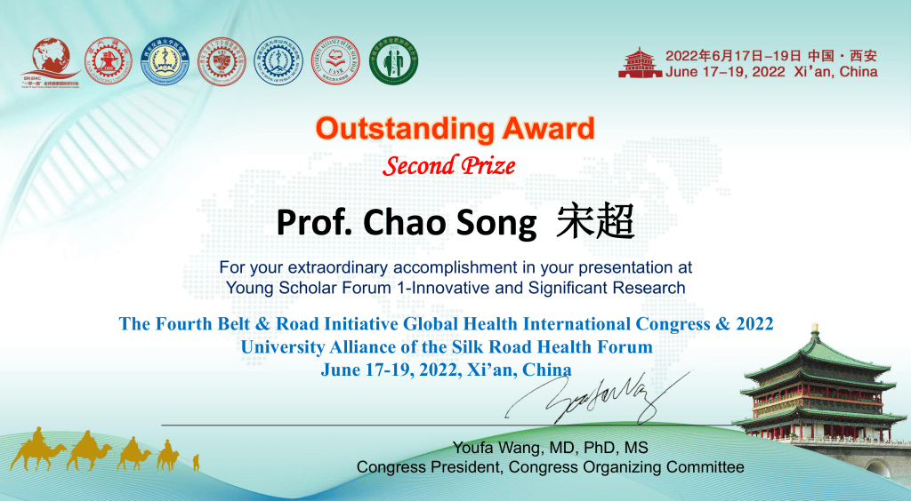June 17–19, 2022. Outstanding Award (Second Prize), presentation at Young Scholar Forum 1-Innovative and Significant Research, The Fourth Belt & Road Initiative Global Health International Congress & 2022 University Alliance of the Silk Road Health Forum. Presentation title: Spatiotemporal heterogeneity in associations of national population ageing with socioeconomic and environmental factors at the global scale.