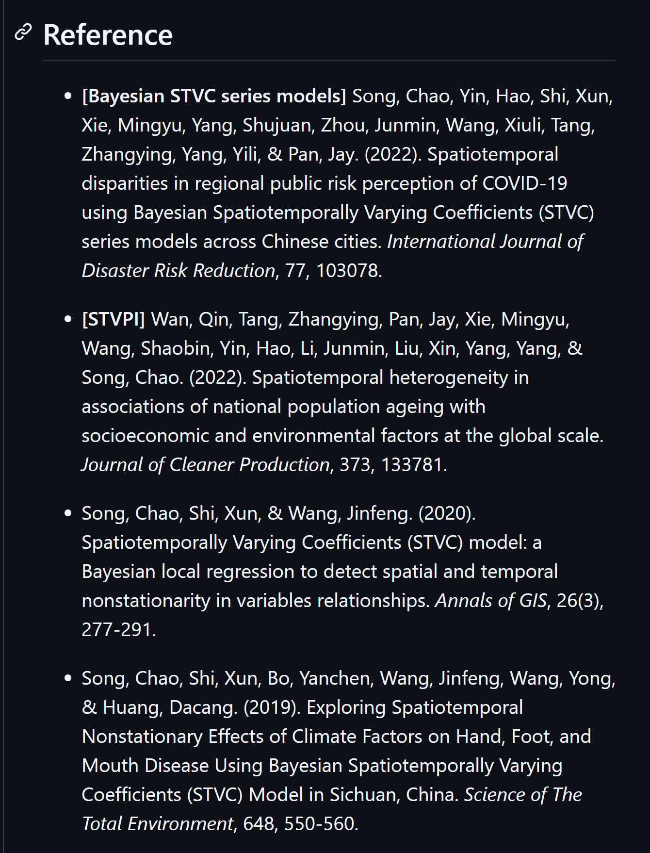 April 2021. Chao Song (PI) was funded by the Fund for Introducing Talents of Sichuan University (Grant No. YJ202157). This three-year project will focus on further developing the Bayesian STVC series modeling technique and applying it in health economics.