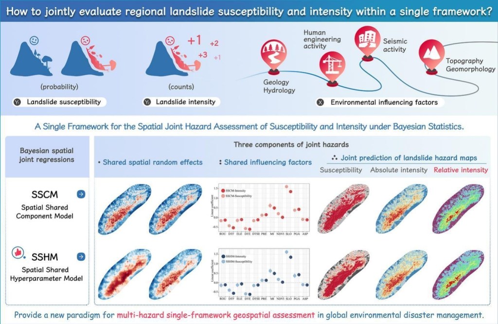 This research introduces two advanced Bayesian spatial joint regression models—Spatial Shared Component Model (SSCM) and Spatial Shared Hyperparameter Model (SSHM)—to assess both landslide susceptibility and intensity within a unified framework. This innovative approach overcomes previous limitations of separately evaluating these two hazard scenarios, offering a novel geospatial paradigm for multi-objective risk assessment in global environmental disaster management.