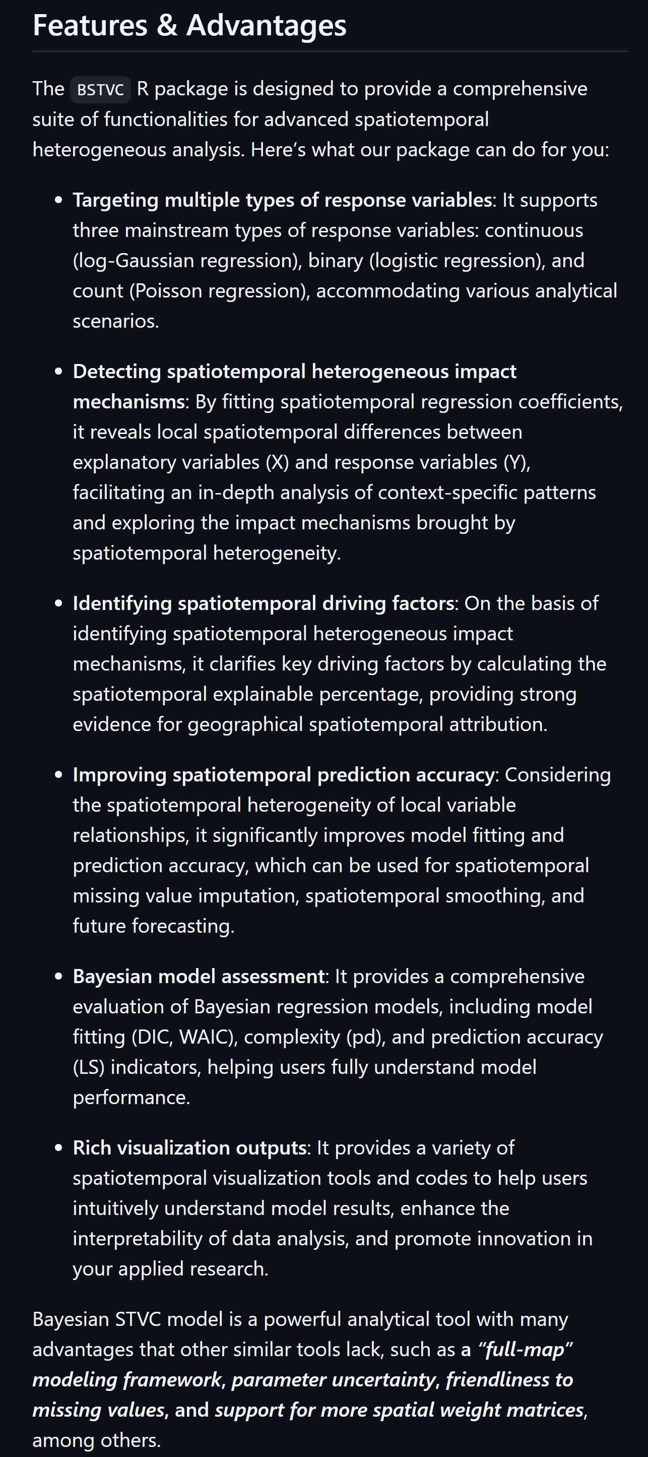 The BSTVC R package is designed to provide a comprehensive suite of functionalities for advanced spatiotemporal heterogeneous analysis. Here’s what our package can do for you: