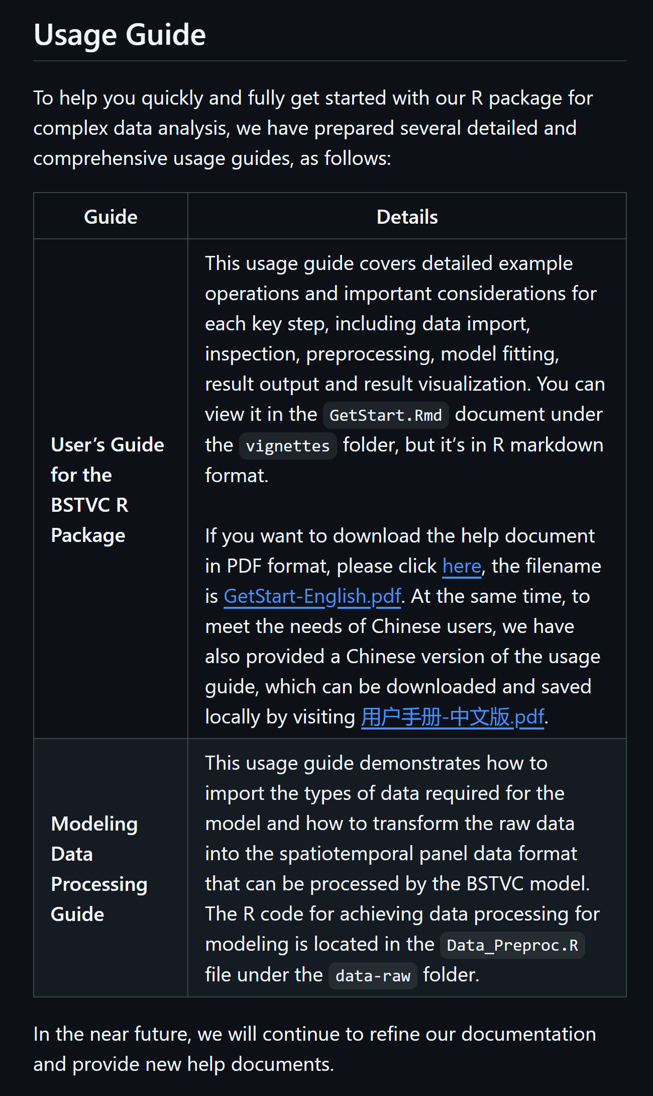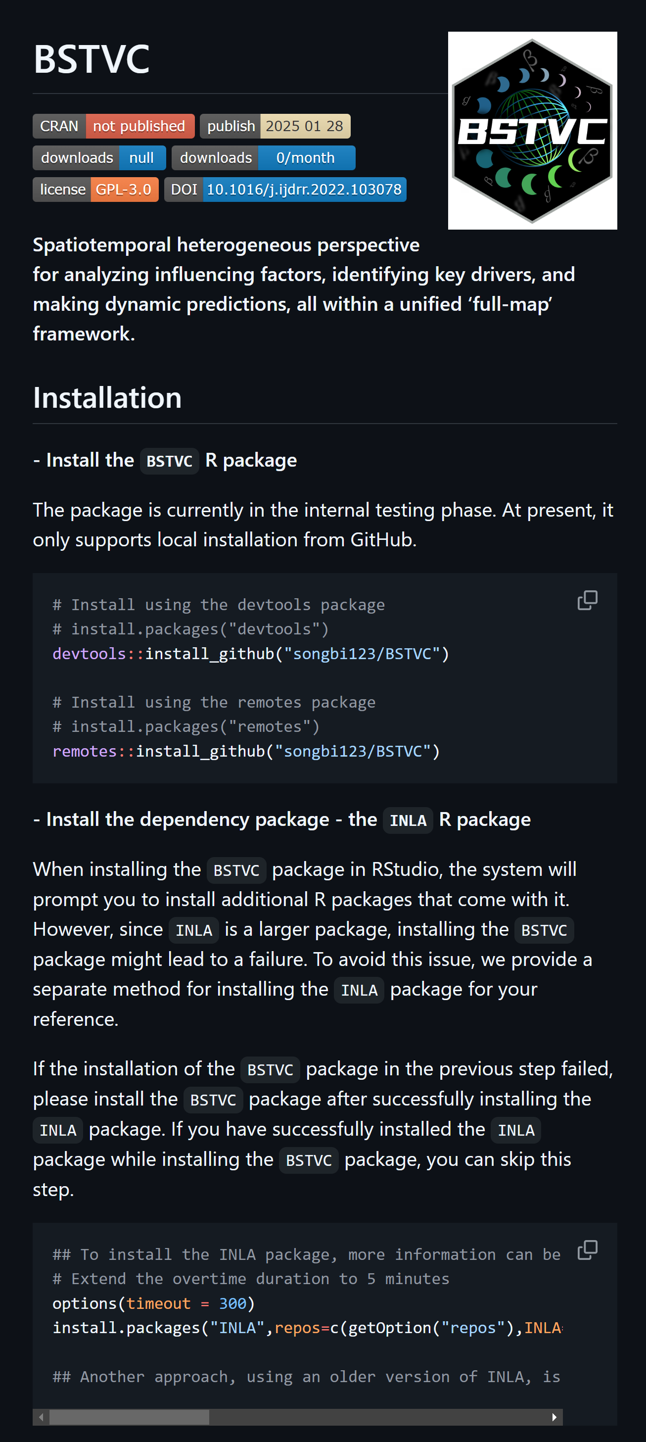 Jaunary, 2025. New R pacakage BSTVC (Bayesian Spatiotemporally Varying Coefficients modeling): Spatiotemporal heterogeneous perspective for analyzing influencing factors, identifying key drivers, and making dynamic predictions, all within a unified ‘full-map’ framework. https://github.com/songbi123/BSTVC