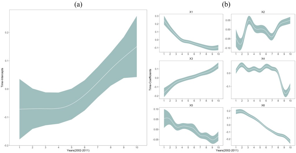 ▲ 图2 论文图形摘要:基于贝叶斯STVC模型探测中国东北县级医疗资源与四种典型社会经济因子(X1城乡居民人均储蓄余额,X2人均金融机构贷款余额,X3人均国内生产总值GDP,X4人均第一产业产值)之间的时空非平稳性。