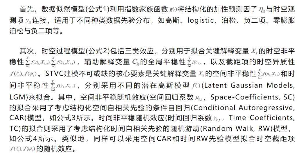 一个基本的贝叶斯STVC模型体现了贝叶斯层次建模(Bayesian Hierarchical Modeling, BHM)的三个层次思想(公式1-4)。
